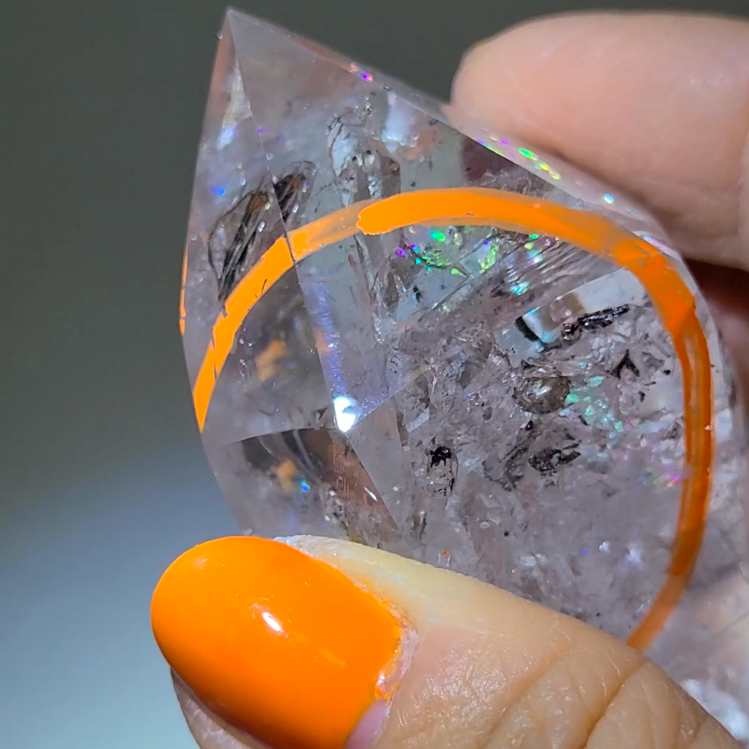The carbon inclusions represent millions of years of compressed organic matter, while the enhydro bubble contains ancient water that moves freely within the crystal structure.