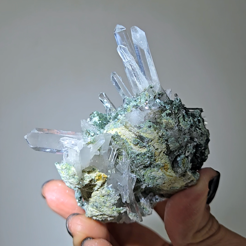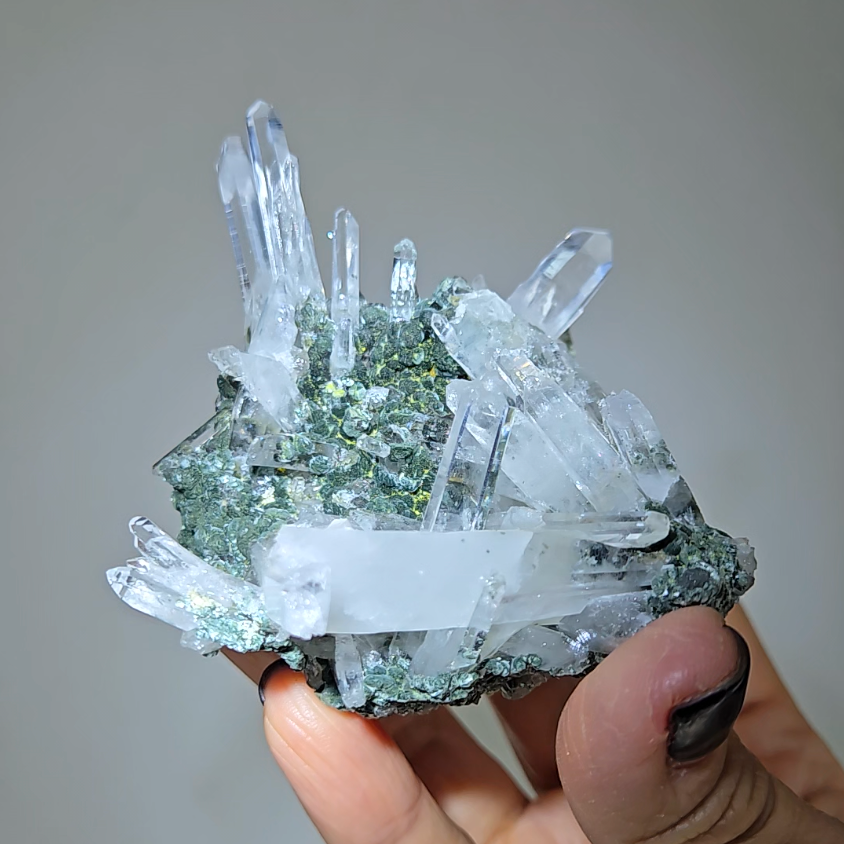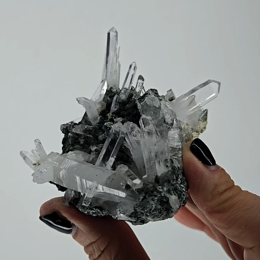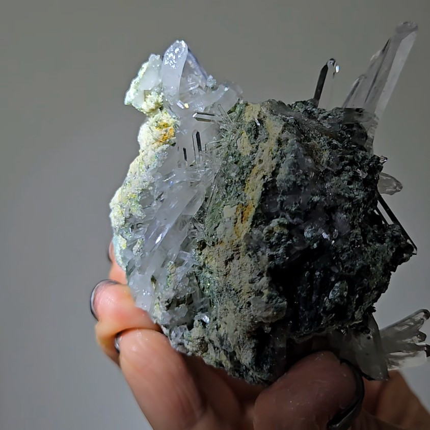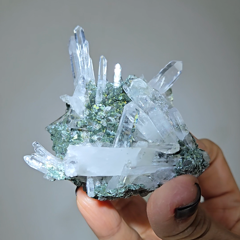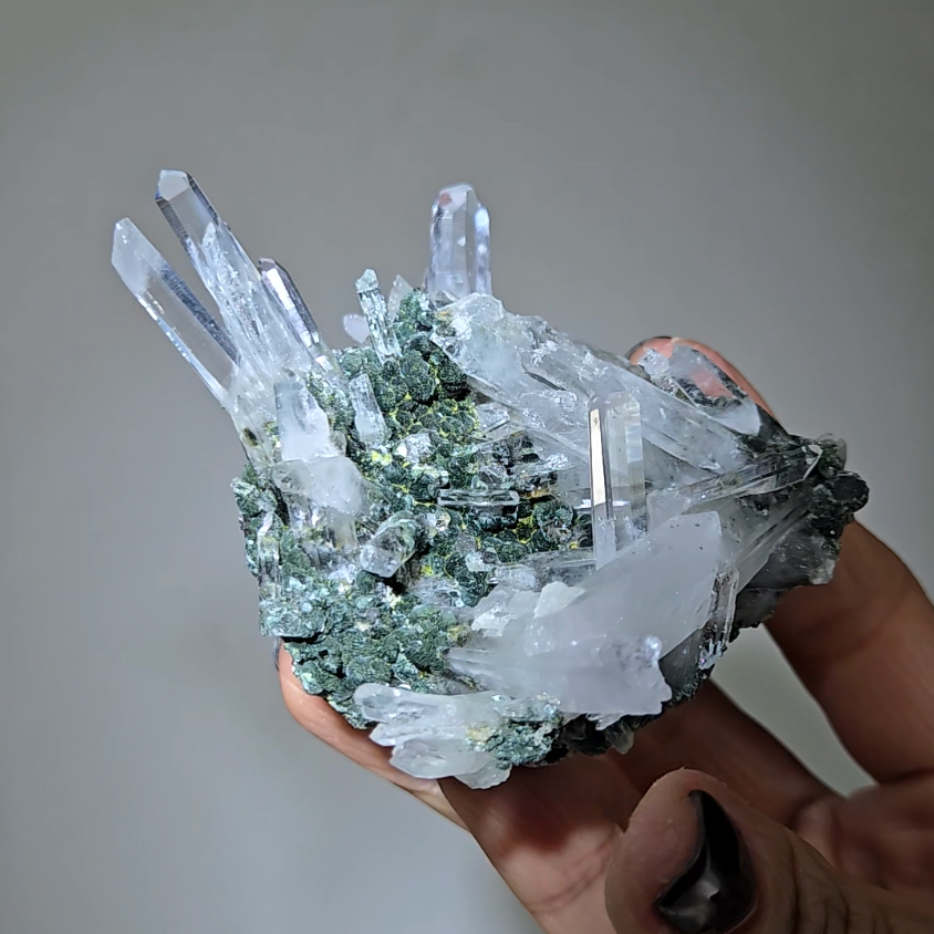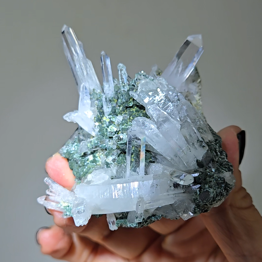 Hold specimen during meditation with needle points directed toward crown chakra. The chlorite matrix grounds energy while needle formations channel Lemurian wisdom directly into consciousness for profound spiritual experiences.